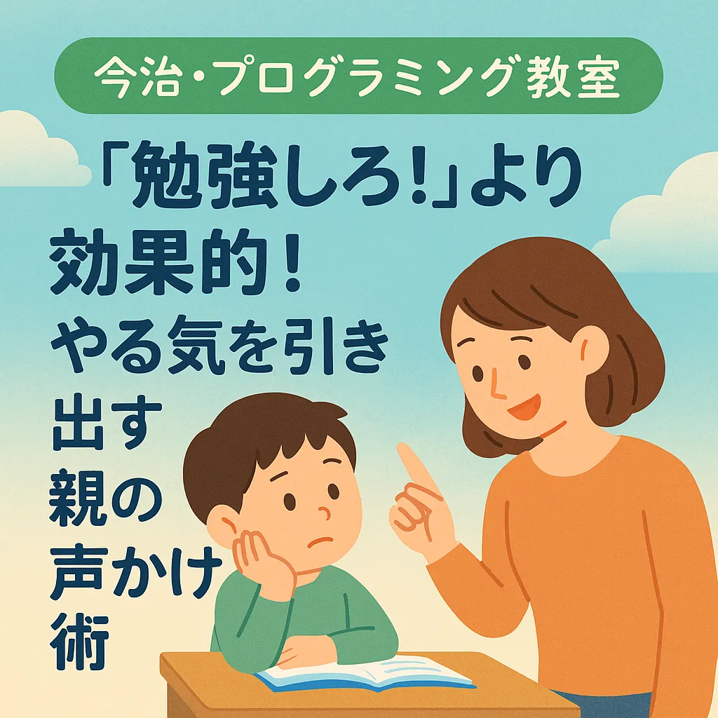 【今治・プログラミング教室】「勉強しろ!」より効果的!やる気を引き出す親の声かけ術 「勉強しなさい!」つい言ってしまう言葉ですよね。 でも、言えば言うほど子どもが机に向かわなくなる…。 そんな経験、ありませんか?実は、「勉強しろ!」という言葉が子どものやる気を奪っている可能性…